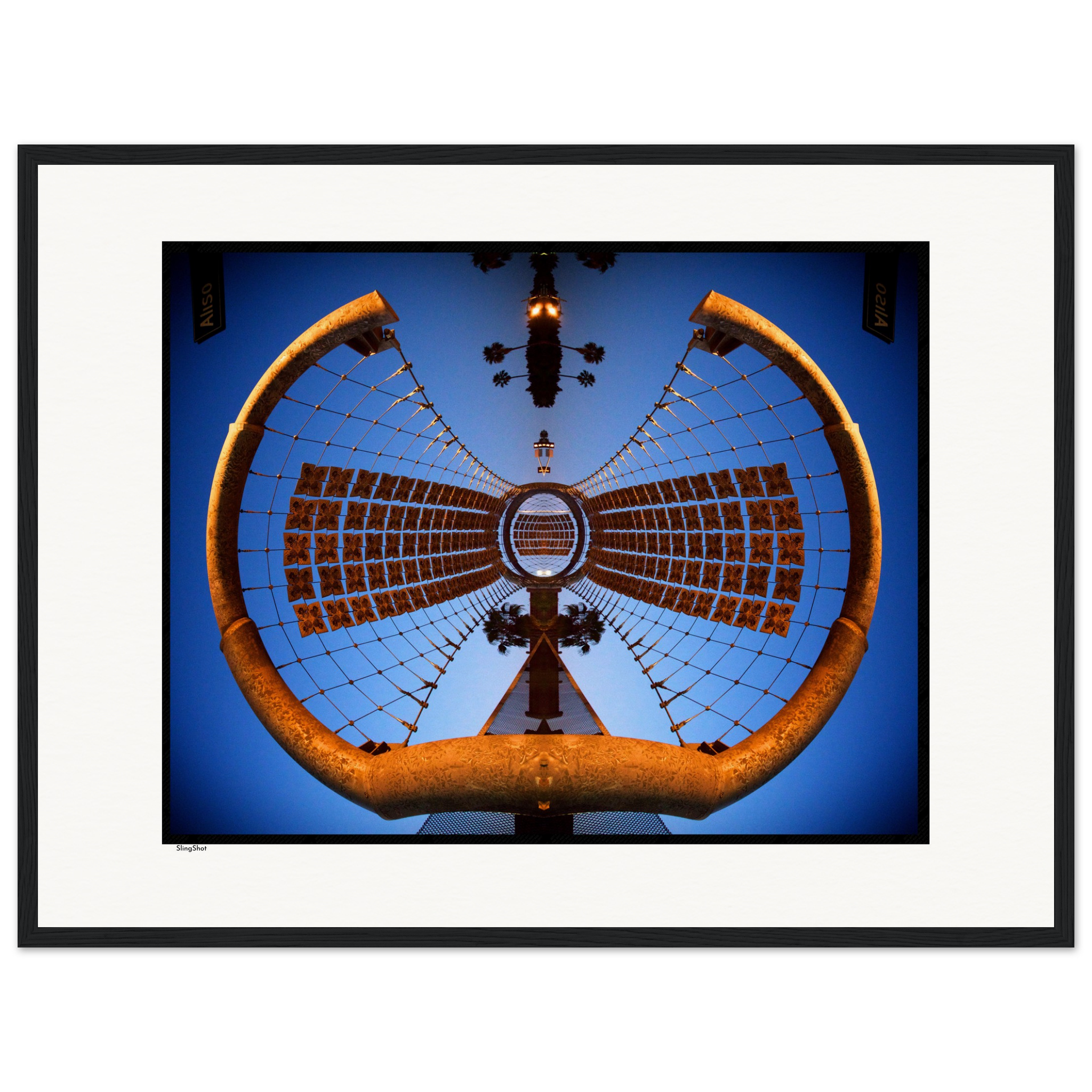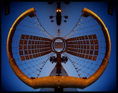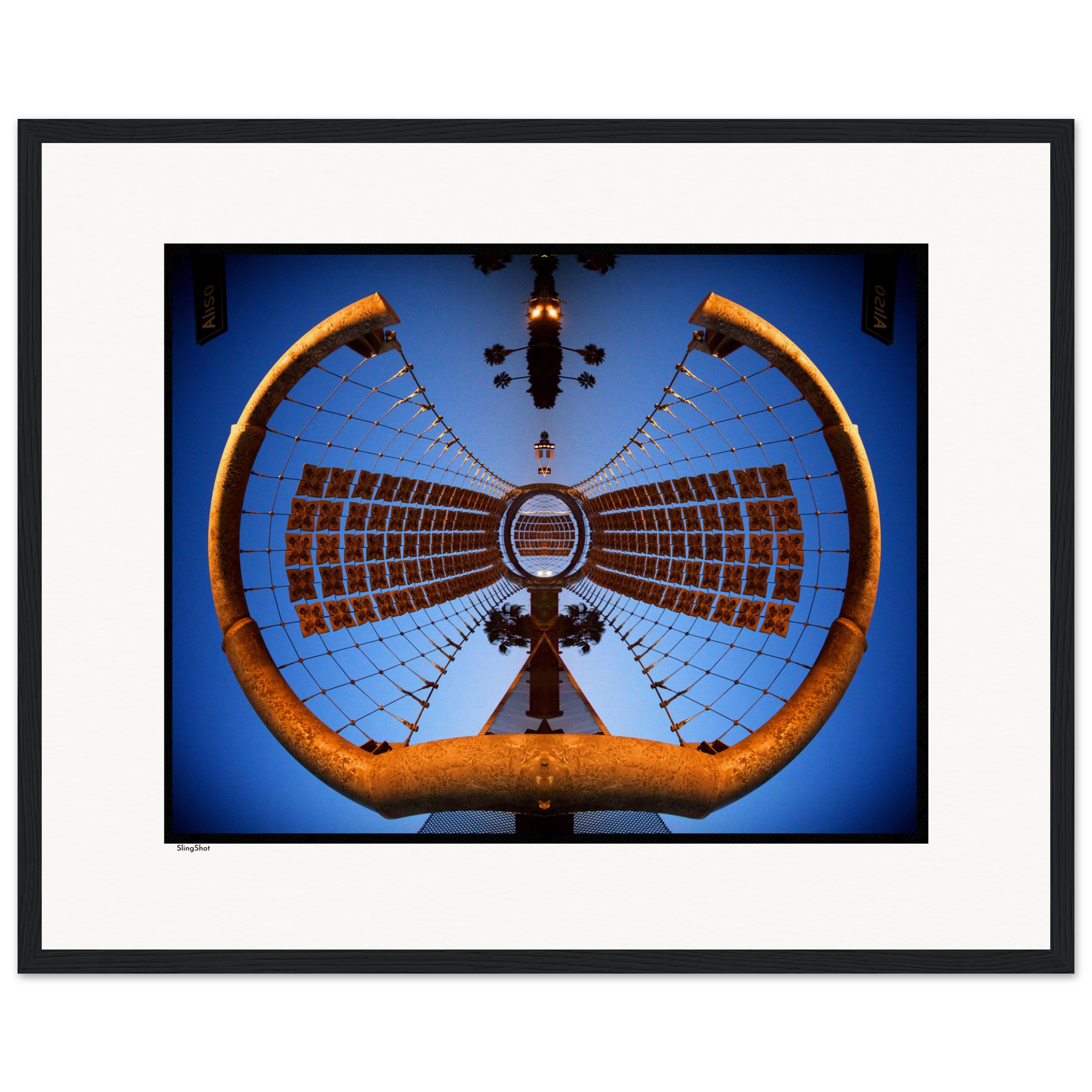 The source image for slingshot is a sculpture that creates an awning over bridge in downtown Los Angeles. Once processed, the image looked like a giant steel slingshot with a glass ball ready to be launched at the viewers face.