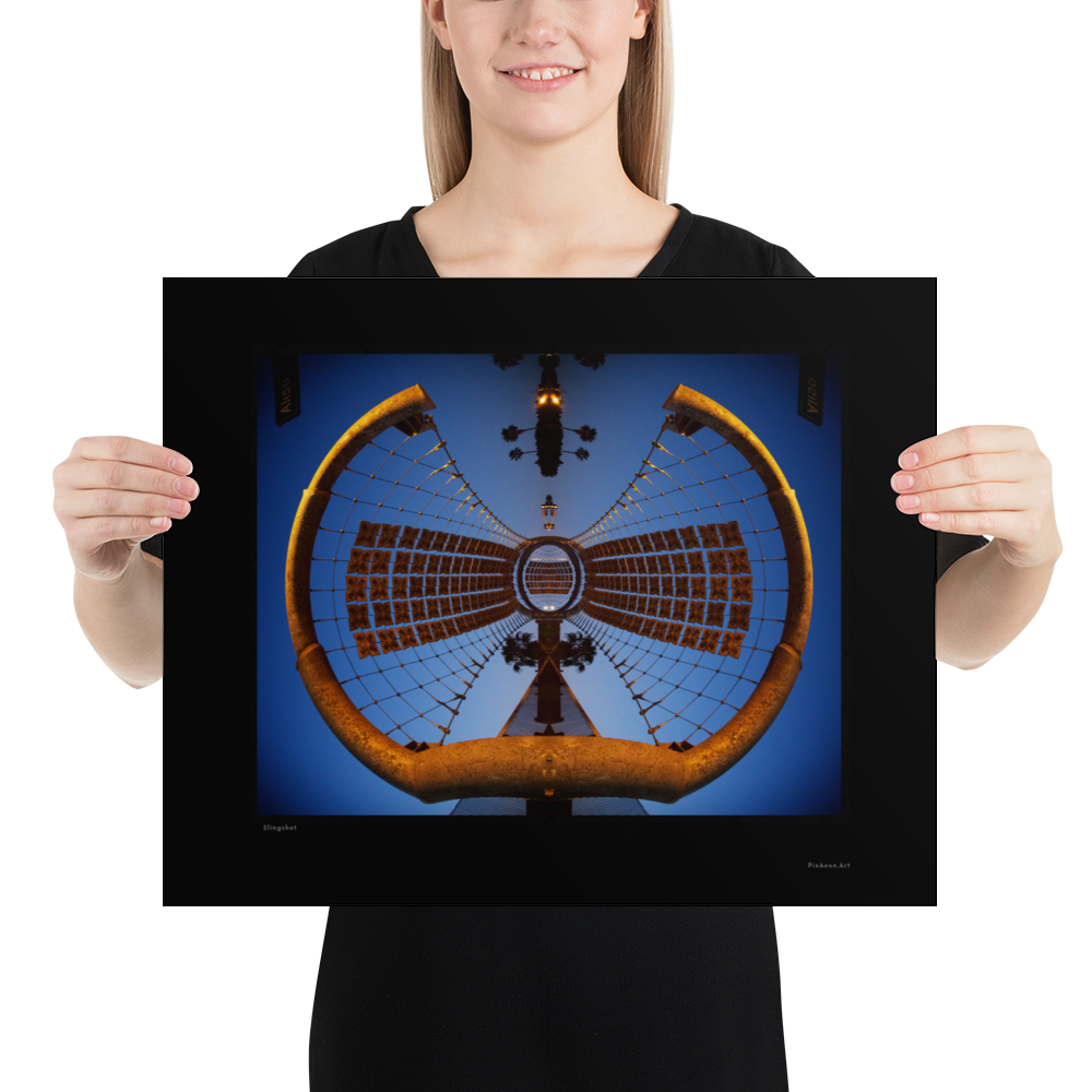 The source image for slingshot is a sculpture that creates an awning over bridge in downtown Los Angeles. Once processed, the image looked like a giant steel slingshot with a glass ball ready to be launched at the viewers face.